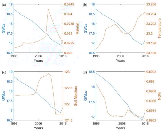 The average groundwater levels, rainfall, and temperature for the years 1996 to 2016 during (a) January, (b) April, (c) August, and (d) November.