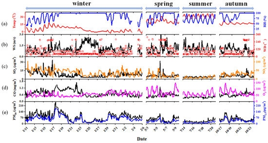 Time series of (a) relative humidity (RH) and temperature; (b) wind direction and wind speed; (c,d) mass concentrations of CO, NO2, SO2, and O3 (hourly data); (e) PM10 and PM2.5 mass concentration during the sampling periods of spring, summer, autumn, and winter.
