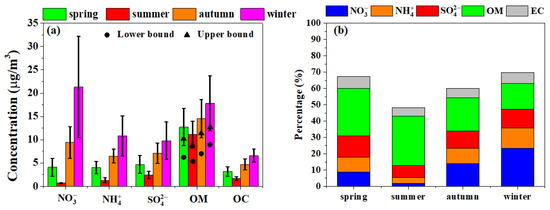 The major composition of PM2.5 was , , , OM, WSOM, and EC in each season, which took up 50–70% of PM2.5. Each component had the highest concentration in winter, followed by autumn, spring, and summer, which is consistent with the seasonal variation of PM2.5, as illustrated in Figure 2a. The relative contribution of each component was different (Figure 2b). The relative contribution of the organic species was almost equal to the inorganic species in spring (~29%) and increased in summer. However, the percentage of organic species in PM2.5 decreased in autumn and winter, which was the same as in previous studies [48,49]. In inorganic species, the contribution of , , and decreased in summer compared to spring and increased in autumn and winter. The proportions of and increased most significantly in autumn and winter, indicating that the increase in PM2.5 was likely due to the formation of and in these seasons. The higher levels of and in winter may be related to the higher stability of NH4NO3 at low temperatures.