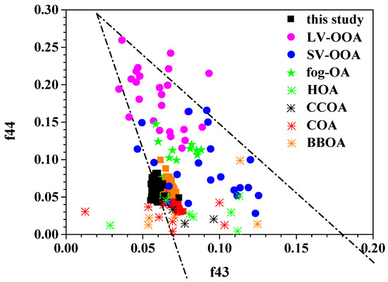Triangle plot of f44 vs. f43 during the sampling periods of different seasons. The solid rectangles in green, red, orange, and black represent the data from the spring, summer, autumn, and winter of this study. Other symbols represent the data of different types of organic aerosol in the literature and the detailed information is summarized in Tables S2 and S3 of the Supplementary Materials. The fog-OA data were from the field observation results in the San Joaquin Valley, California. The dashed guidelines were derived from the data reported by [54]. The LO-OOA and MO-OOA in some studies were treated as SV-OOA and LV-OOA, as suggested by [32].