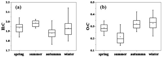 The elemental ratios of atomic hydrogen-to-carbon (H:C) and oxygen-to-carbon (O:C) in the different seasons are shown in Figure 4. The average H:C were 1.94 ± 0.05, 1.99 ± 0.04, 1.88 ± 0.06, and 1.84 ± 0.05 in spring, summer, autumn, and winter, respectively. The O:C values showed a different variation trend with H:C. The average O:C values were 0.32 ± 0.04, 0.30 ± 0.05, 0.29 ± 0.03, and 0.22 ± 0.06 in autumn, winter, spring and summer, respectively. The high H:C and low O:C values in spring and summer suggested that the organic aerosols were less aged compared to autumn and winter. It was likely due to the higher proportion of less-oxidized OA in spring and summer, while the OA in autumn and winter were more oxidized, as discussed in Section 3.2.