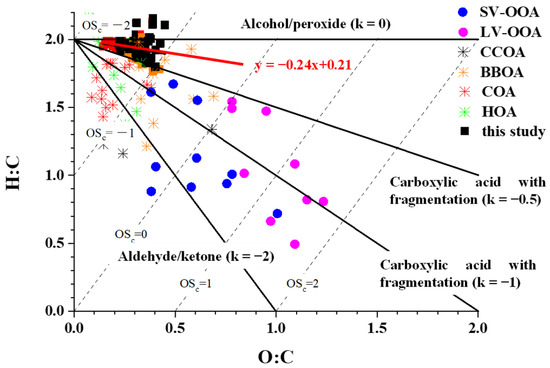 The Van Krevelen-c diagram. The meanings of the symbols are the same as those in Figure 3, and the detailed information is also summarized in Tables S2 and S3 in the Supplementary Materials. The dashed lines represent the average carbon oxidation state [57] and the slopes represent the different functionalization processes of organic species [56].