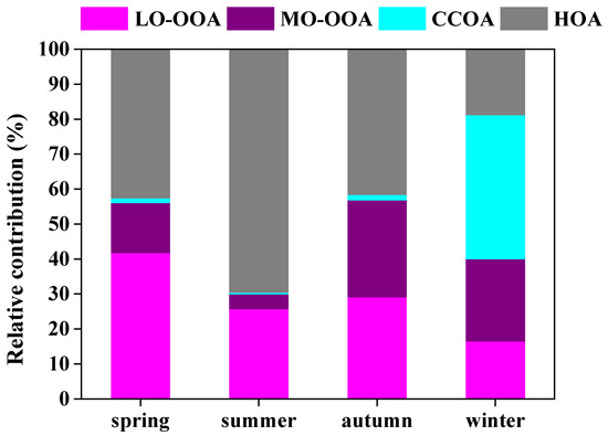 The relative contribution of LO-OOA, MO-OOA, CCOA, and HOA to WSOC during the sampling periods in different seasons.