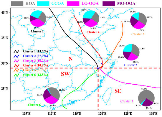 The 48-h backward trajectories of the air parcels during the sampling periods in each season were grouped into six clusters, as shown in Figure 8. The geographical areas, which the air parcels passed through, were divided into three parts according to their directions relative to Longyou: north, southwest, and southeast. The trajectories of clusters 1, 2, 4, and 5 were from the north part and took up 13.5%, 37.9%, 10.8%, and 8.1% of all trajectories, respectively, and the arrival time of the responding air parcels was mainly in winter, as illustrated in Figure S6 in the Supplementary Materials. It can be seen that the CCOA made significant contributions to the aerosols from these regions, especially for inland areas (cluster 1, 2, and 4), probably due to the increasing demand for heating in north China during the winter. The trajectories of cluster 3, which accounted for 16.2% of all trajectories, were from the marine area of east China, and the arrival times of these air parcels were mainly in summer. The HOA was the dominant component in the WSOC originating from these areas, suggesting that the aerosols were fresh and were not highly oxidized along the transport path, which might be one of the reasons why HOA had the highest proportion in summer. The air parcels of cluster 6, where the arrival times were mainly in autumn, stemmed from the sea to the south of Guangdong province, and their trajectories took up 13.5% of all trajectories. Although the HOA also had a large proportion of the WSOC, the contribution of LO-OOA increased significantly compared to the aerosols in cluster 3, which might be as a result of the oxidation of HOA.