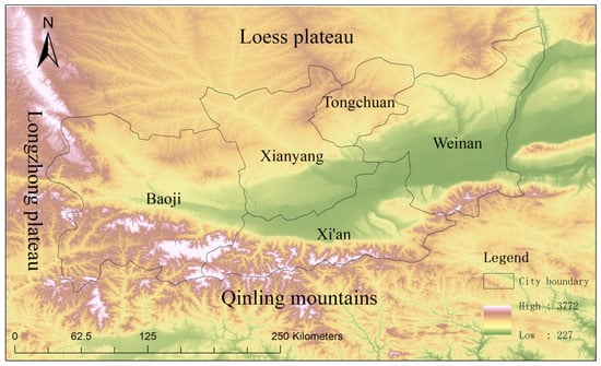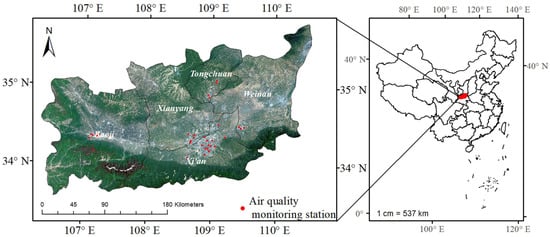 The Guanzhong area is located in the central part of Shaanxi Province, China, and it includes the cities Xi’an, Xianyang, Weinan, Baoji, and Tongchuan. The Guanzhong area has a temperate monsoon climate, which is dominated by northwest winds in winter, when haze occurs frequently. The geographical location of the study area is shown in Figure 1.
