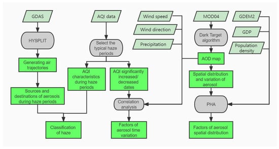 The AQI was used as a reference to determine the duration of the haze period. The HYSPLIT model was used to analyze the forward and backward trajectories of the air mass during the haze period to determine the source and destination of aerosol particles. MODIS data were used to invert the AOD of the study area during the haze period to analyze the spatial distribution characteristics and changes in aerosols. DEM, GDP, and population density data were used to analyze the factors influencing the spatial distribution of aerosols during the haze period. The time period when the AQI significantly increased or decreased was selected from the duration of the haze period, and the wind speed, wind direction, and precipitation data in this time period were combined to analyze the influencing factors of AOD at the same location over time. The process is shown in Figure 2.