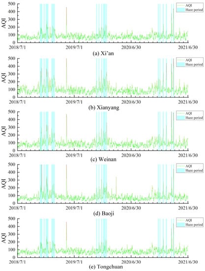 Statistical analyses have shown that the air quality in each haze process has a changing trend from low to high to low. In this study, the period when the AQI of more than half of the cities (3 or more) in the Guanzhong area reached more than 200 was selected as the haze period. Considering the situation of the 5 cities, 19 haze period processes were determined and are marked in Figure 4.
