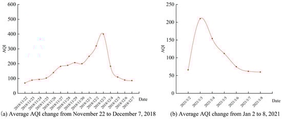 Changes in AQI during the haze period. It is the average of all sites. (a) The maximum AQI occurs in the late period. (b) The maximum AQI occurs in the early period.