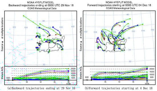 The haze period from 22 November to 7 December 2018, was selected as an example to analyze the trajectory characteristics of locally generated haze. According to the historical AQI values of each city, the AQI value increased significantly from 28 November to 29 and decreased significantly from December 4 to 5. The backward trajectory of the air mass on 29 November 2018 and the forward trajectory of the air mass on 6 December 2018 generated by the HYSPLIT model are shown in Figure 6.