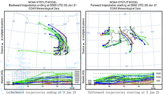 Trajectory characteristics of the air mass in the externally transported type haze period. The meaning of the colored line segments is the same as those in Figure 6. (a) shows the track of the air mass in Guanzhong from 2 to 3 January 2021 and (b) shows the track of the air mass in Guanzhong from 5 to 6 January 2021.