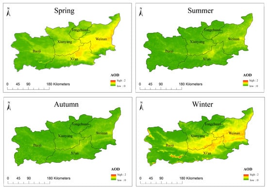 - The AOD of the Guanzhong area was higher in winter (0.39) and spring (0.37) and lower in summer (0.20) and autumn (0.14). The spatial distribution of AOD was high in the central and eastern areas and low in the rest of the areas.
