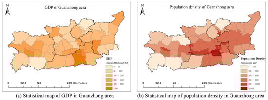 Statistical chart of socioeconomic factors in the Guanzhong area from 2019 to 2021. (a) shows the GDP in Guanzhong area, and (b) shows the population density in Guanzhong area. The figure shows that the economic and population centers of the Guanzhong area are mainly located in the central and eastern parts.