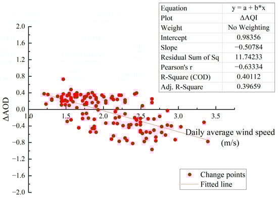 The daily average wind speed of each city during the 27 and 25 significant increases and decreases, respectively, in the AQI was determined, and the null values and outliers were eliminated, resulting in a total of 134 valid station data. Wind speed data were obtained from NOAA-NCEI daily meteorological data. A linear function model was established to fit the relationship between the daily average wind speed and AOD change.