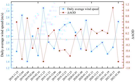 Relationship between daily average wind speed v and ΔAOD. The horizontal axis shows the dates, including dates that satisfy both the wind speed data of the monitoring station and the AOD value from the inverted MODIS image, and the significant AQI change date was identified. The left vertical axis is the daily average wind speed, and the right vertical axis is the daily variation of AOD. The black dashed is ΔAOD = 0, which intersects the left axis at 2.1 m/s position.