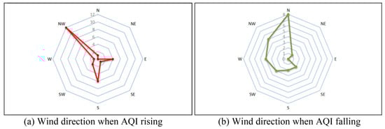 Statistical diagram of the wind direction when AQI obviously increases and decreases during the haze period. (a) is the wind direction when the AQI rising, and (b) is the wind direction when the AQI falling.