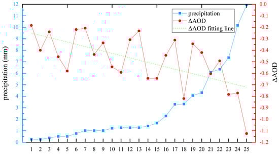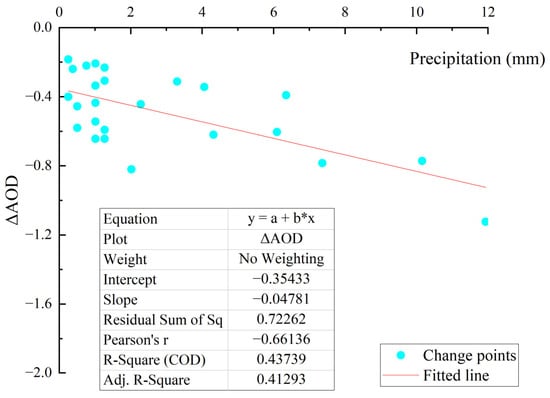 Because of the need to satisfy the three conditions of obvious AQI change, available precipitation data at the monitoring station, and simultaneous AOD inversion values, only 25 valid data were finally acquired. The fitting results for the precipitation data and AOD change values are shown in Figure 13.