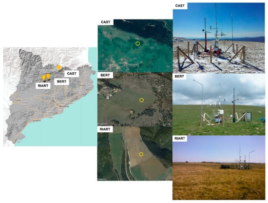 From left to right: Location of the study sites (source of the map: Institut Cartogràfic i Geològic de Catalunya, https://www.icgc.cat/, accessed on 10 January 2021); aerial view (source: googlemaps); and pictures of the eddy covariance flux stations (source: Laboratory of Functional Ecology and Global Change (ECOFUN), http://ecofun.ctfc.cat/, accessed on 10 January 2021). The more detailed aerial view of the study sites can be seen in the Annex S1 of the Supplementary Material.