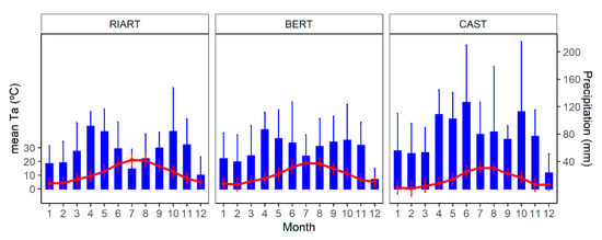 Climogram of the study sites, mean air temperature (Ta), and precipitation. Data sources: Ta, eddy covariance flux stations from the period 2012–2020; precipitation from the closest meteorological stations of the Servei Meteorologic de Catalunya (see Annex S2).
