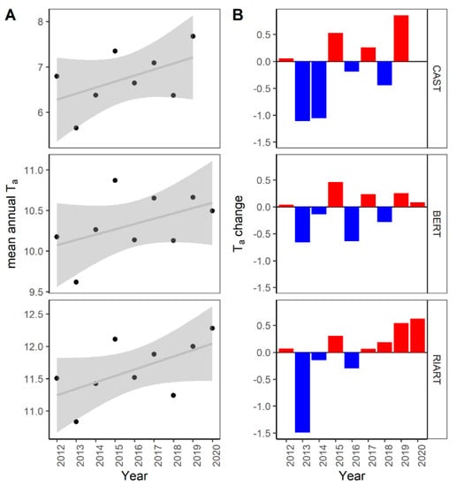 (A) Mean annual temperatures (Ta, dots) along time, linear relationship and 95% confidence interval and (B) temperature difference compared to the average in the period 2012–2020. Data source: eddy covariance flux stations.