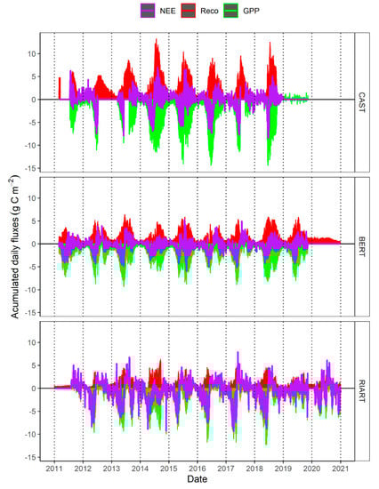 The eddy covariance stations recorded net CO2 fluxes according to the corresponding footprints. The footprint was calculated based on the Kljun model [] and we filtered the data according to the dimensions of the study areas, including all the fluxes in which more than 80% of the contribution came from the area of interest []. That footprint length (80%) was mostly within 250 m in RIART, within 150 m in BERT, and within 200 m in CAST. Afterwards, we gap-filled the NEE data using the sMDSGapFill function [] of the REddyProc package [] for R software (R version 4. 2.2, R Core Team, 2022, Vienna, Austria). Gap filled NEE data were also partitioned into gross primary production (GPP) and ecosystem respiration (Reco), according the night-time based partitioning approximation, using the SMRFLuxPartition equation, which also comes from the REddyProc package.