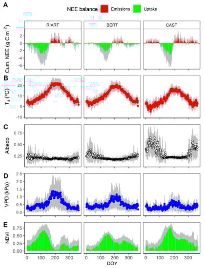 Intra-annual dynamics, mean daily averaged ± 1 SD (grey area) of (A): cumulative net ecosystem exchange (NEE); (B) air temperature (Ta); (C) albedo; (D) vapor pressure deficit (VPD); (E) and normalized vegetation index (NDVI). Source: eddy covariance flux stations.