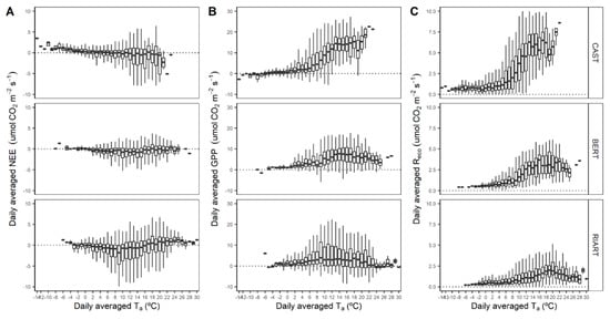Daily averaged CO2 fluxes as function of daily averaged ambient temperature (Ta): (A) net ecosystem exchange (NEE); (B) gross primary production (GPP); and (C) ecosystem respiration (Reco). The boxplots display the first and the third quartile (boxes), the median (horizontal line), and the minimum and maximum values (whiskers).