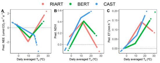 In the specific case of our sub-alpine grassland (CAST), plants here seem to not be water limited yet, as shows the greenery of the vegetation even though the high summer temperatures (NDVI~Ta, Figure 7A) and the increasing evapotranspiration rates with increasing temperatures (ET~Ta, Figure 7B). Additionally, during summer, the soil water content at CAST does not reach such low values as it does at the montane grasslands (Figure S1); and even at the lowest soil water content, the NEE at CAST is more often dominated by net uptake than by emissions than in the montane grasslands (Figure S1). Overall, this suggests that the vegetation may be still adopting a ‘water spending strategy’ [], not regulating the stomatal conductance until the soil water content approaches a wilting point []. This strategy can make the system resilient when drought periods are occasional, since CO2 exchange is not reduced, but may have negative consequences on the ecosystem if drought periods are more frequent and longer [,].