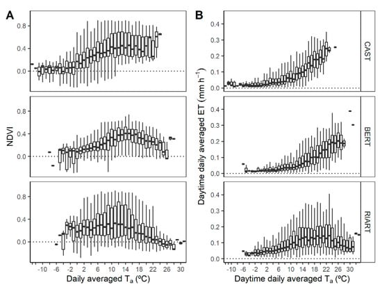 Daily averaged (A) normalized vegetation index (NDVI) as function of ambient temperature (Ta); (B) evapotranspiration (ET) as function of ambient temperature (Ta).