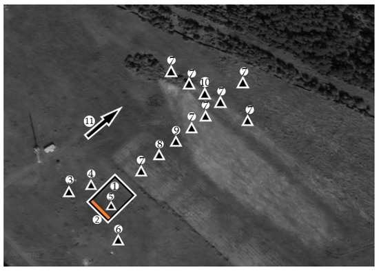 Satellite image of the BEC and the experimental site areas with measuring equipment: (1) experimental area, 10 × 4 m; (2) ignition line; (3) monitoring and recording equipment (PC and data logger “ZET LAB”); (4) JADE J530SB IR camera; (5) rack with thermocouples; (6) video camera; (7) rack with aerosol sensors; (8) AMK-03 weather station on a 3 m mast; (9) AMK-03 weather station on a 10 m mast; (10) AMK-03 weather station on a 6 m mast; (11) predominant wind direction during the experiment.