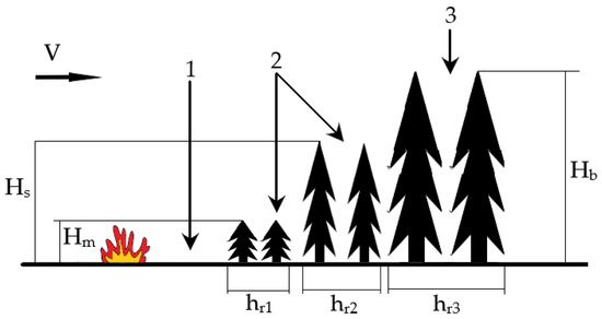 Scheme of the experimental site (side view): (1) “accelerating site” of a ground fire; (2) undergrowth and shrubs; (3) model forest canopy.