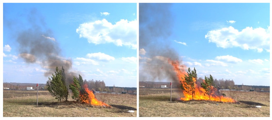 The experimental site (Figure 2) was an “accelerating site” of a ground fire, 1, an area of undergrowth and shrubs, 2, and a model forest canopy, 3. Zone 1 was ignited similarly [14] uniformly over the entire width (Figure 3). Zones 2 and 3 were reconstructed from undergrowth () and pines (), which were preharvested during thinning in the territory of Tomsk forestry. Moisture content of vegetation was kept at natural values (moisture content of needles was W = 114%). The maximum height of trees () in the reconstructed forest canopy did not exceed 4.5 m. The lengths of the sections were