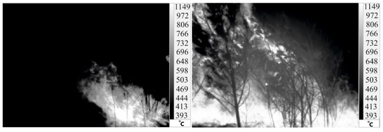 The IR thermogram (Figure 4) shows the temperature distribution in the flame at various moments in time during the transition from a ground fire to a crown fire. Obviously, the combustion process is essentially unsteady and is accompanied by developed turbulence in the flame.