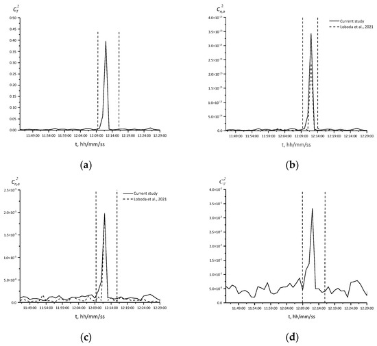 Ref. [14] shows that turbulent processes in the flame lead to the formation of induced atmospheric turbulence as a result of dissipation and general heat release, which is shown in the value change of the structural constant of fluctuations of the refractive index, , obtained by optical and acoustic methods, as well as the structural constant fluctuations in temperature, , and wind speed, , which is associated with changes in air density. Figure 5 shows graphs of fluctuations in the refractive index, which were calculated using the following expressions: