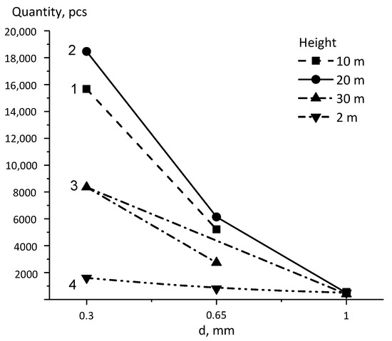 Distribution of aerosol concentration by particle diameter at a distance of 125 m from the combustion source at different heights.
