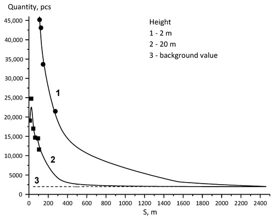 Analyzing Figure 6, one can conclude that for the detection of aerosols in the atmosphere from wildfires, the most optimal heights are in the range of 10–20 m. Figure 7 shows experimental data on the concentration of aerosols with a particle diameter of at least 0.3 μm at a height of 20 m and 2 m at various distances from the fire source, as well as extrapolation curves. One can see from Figure 7 that with a combustion source size of 4 × 10 m, the maximum distance where the aerosol concentration in the air exceeds the background values at a height of 2 m and 20 m does not exceed 800 m and 2000 m, respectively. It is obvious that at a height of 20 m, based on the concentration of aerosol combustion products, it is possible to reliably record a smoke plume from a wildfire at a significantly greater distance.