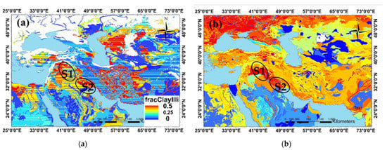 The clay (a) and silt fractions (b) of dust aerosols at emissions for the soil mineral fraction (SMF) method in the Middle East region (S1 and S2 are dust sources).