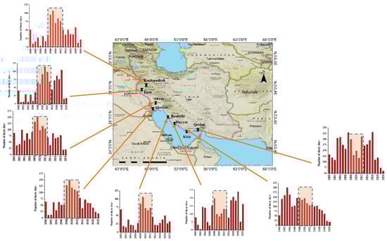 In this section, the evolution of dust events was analyzed at the eight weather stations in the west, southwest, and south of Iran from 2000 to 2020. There are local dust sources in the Khuzestan Plain; the northern parts of the Persian Gulf and Bushehr station recorded high percentages of reported dust. The weather code (07) is related to dust from the deserts in this area []. Some parts of the Qeshm and Kish Islands in the Persian Gulf are desert areas. From 2007 to 2017, it was found that local dust over Kish and Qeshm islands was higher than non-local dust, contributing to 89% and 96% in Kish and Qeshm, respectively []. Thus, the dominant dust in Kish and Qeshm Islands was local; however, at Bushehr and Dayyer port stations, local dust made up only 26% of the total dust at the Bushehr weather station [,].