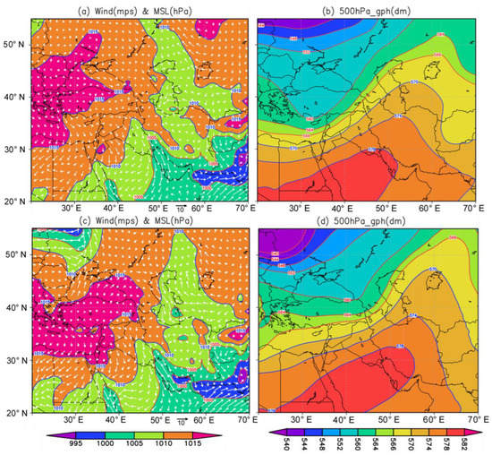 Sea level pressure (shaded as in the legend and solid color contours, interval is 5 mb), wind (ms−1), and 500-hPa geopotential height (shaded as in the legend and solid red and blue contours, interval is 4 dam) at 00UTC on 1 and 2 June 2012. (a) and (b) for 1 June 2012, (c) and (d) for 2 June 2012.