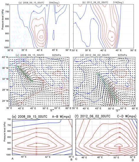 The topography surrounding Mesopotamia and north of the PG plays a major role in the development of LLJs through the interaction of meteorological conditions and mountain forces. To investigate the structure and vertical expansion of the LLJ for the studied cases, the vertical cross-sections of the wind speed along the lines from A to B in Figure 5c and from C to D in Figure 5d at 00 UTC on 15 September 2008 and 2 June 2012 are shown in Figure 5e,f.