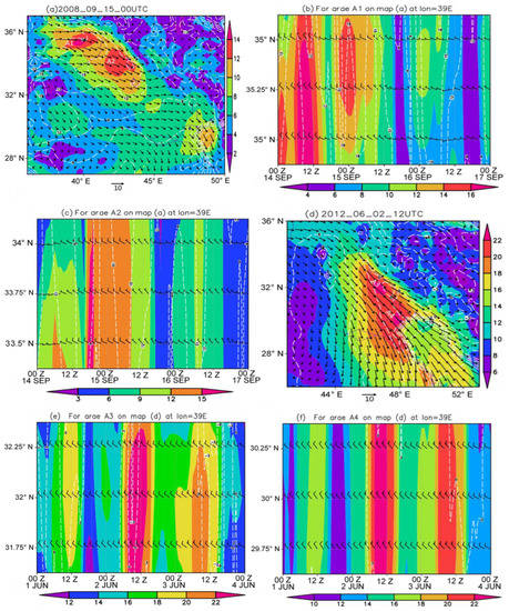 The vertical cross-section of the wind speed was assessed for the dust event days. The structure and persistence of low-level jets (LLJs) were investigated at 00 and 12 UTC on 15 and 16 September 2008 at latitudes of 35, 34, and 33° N, and on 1, 2, and 3 June 2012 at latitudes of 35, 33, and 31° N. LLJs occurred on 1–3 June 2012 and 15 and 16 September 2008 (only the figures of two particular times, i.e., 00 UTC on 15 September and 2 June, are shown).