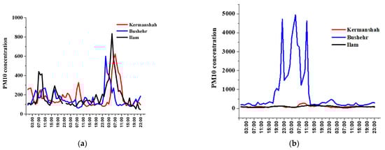 The measured concentrations from two stations in the west of Iran in both cases (Ilam and Kermanshah) and Bushehr on the northern shore of the Persian Gulf are shown in Figure 7a,b from 14 to 17 September 2008 and 1 to 3 June 2012. In the first case, both stations in the west of Iran reported high surface dust concentrations between 03 and 07 UTC on 17 September. Dust concentrations reached 834 μg m−3 at Ilam station, 623 μg m−3 at Kermanshah station, and 612 μg m−3 at Bushehr station in the north of the Persian Gulf. However, surprisingly, in the second case, at Bushehr station on the north shore of the Persian Gulf, the highest measured concentrations were 4947, 4626, and 3759 μg m−3 on 2 and 3 July. Moreover, the measured concentrations were higher than 3000 μg m−3 in many measured records at the station. These amounts are much higher than the concentrations reported at Ilam and Kermanshah in the west of Iran.