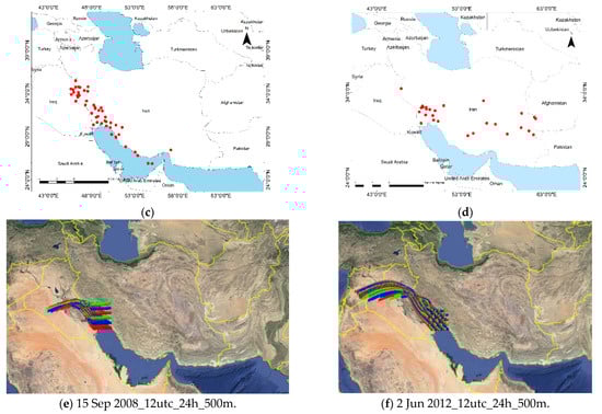 Hence, the 24 h backward air mass trajectories obtained from the HYSPLIT model at 500 m were used for SW Iran (Figure 7e,f). Since the dust storms covered a wide area in different parts of Iran, we selected the matrix approach in the HYSPLIT runs in order to identify the dust sources. Satellite images show that the dust storms began on 14 September 2008 and 1 June 2012, so the model ran for 24 h. In both dust storms (on 15 September 2008 and 2 June 2012), the prevailing winds were from northern directions, so dust particles affected the west and southwest of Iran. The HYSPLIT model outputs show that, in both dust storm cases, dust particles came from the west of Iraq, and on 1 June 2012, some of the dust particles came from the eastern deserts of Syria.