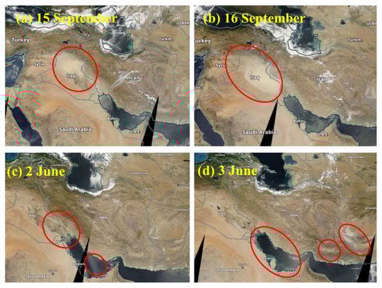 Figure 8 shows Terra/MODIS true color imagery during the dust storms on 15–16 September 2008 and 2–3 June 2012, respectively. On 15 September 2008, one of the most intense dust storms originated from deserts in the northern half of Iraq and was affected by northwesterly winds. Thus, dust particles entered the west and southwest of Iran. On 16 September, the dust mass entered the west of Iran and spread over the Persian Gulf (the red circles show the dust masses).