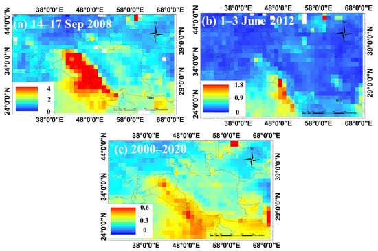 Mean AOD550 spatial distribution from Terra-MODIS observations during the periods (a) 14–17 September 2008, (b) 1–3 June 2012, (c) 2000–2020.