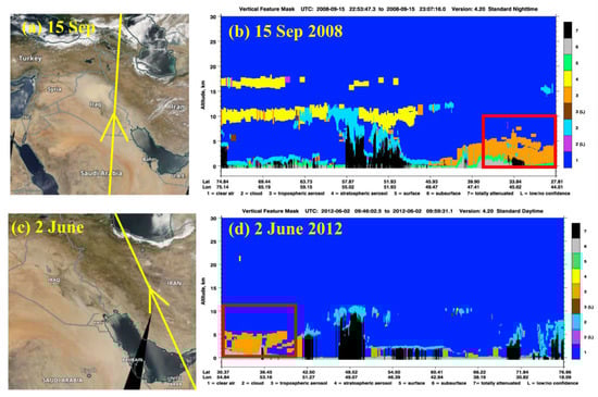 True-color imagery from Aqua/MODIS was used in the two dust storm events over the Middle East area; CALIPSO overpasses over the region are shown with yellow arrows (first column). In Figure 10, an intense dust plume was detected over northern Iraq and western Iran in the first case while the dust plume was detected over southern Iraq, Kuwait, the Persian Gulf, and northern Saudi Arabia in the second case. According to the CALIPSO profiles, this dust plume rose higher in the first case and dust particles rose higher than 7 km over Mesopotamia toward the eastern Arabian Peninsula; the height of the dust plume did not decrease on 15 September 2008. On 2 June 2012, the dust plumes did not ascend as the first case but rose higher than 5 km in a vast area over the Persian Gulf and south of Iran. It seems that the NAAPS model’s vertical profile output agrees with the CALIPSO vertical profile over the Persian Gulf in this case, and dust rose higher than 5 km (500 hPa). This result is not off; the dust rising occurred at different levels of the atmosphere, and many dust particles reached 5 km (or even 6 km) in height [,,].