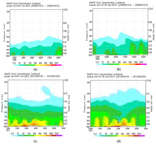 Vertical distribution of NAAPS output dust (μg m−3) in (a,c) the Persian Gulf and (b,d) Basra stations from 13 to 19 September 2008 and from 1 to 6 June 2012.