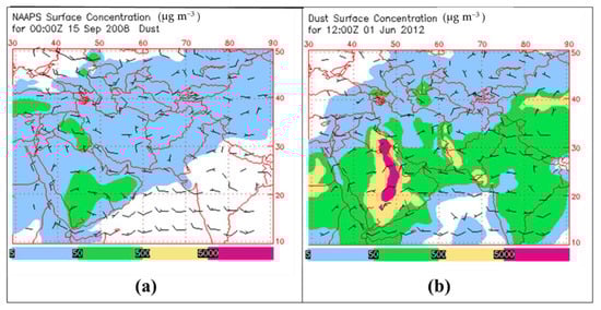 Surface dust concentration and wind direction from the NAAPS model at (a) 00 UTC on 15 September 2008, (b) 12 UTC on 1 June 2012.