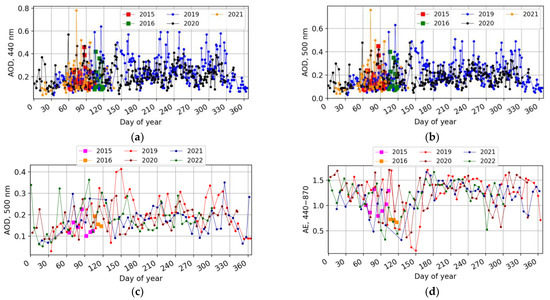 Aerosol optical depth and Ångström exponent during the 2015–2022 period; (a) AOD (440 nm) and (b) AOD (500 nm) daily mean data; (c) AOD (500 nm) and (d) AE (440–870 nm) weekly mean data. The AERONET sun-photometer data (a,b) level 2.0 (2015–2021) and level 1.5 (2021–2022); see details in the text. Data in (c,d) level 2.0 (2015–2019) and level 1.5 (2020–2022).