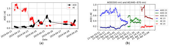 Changes in aerosol optical depth (AOD 500 nm) and Ångström exponent (AE 470–870 nm) during (a) the 21–29 April period and (b) day time of 23–25 April 2019, Nicosia, Cyprus. Data level 2.0.