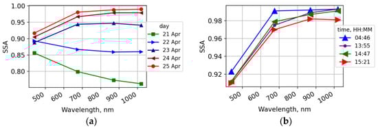 The single-scattering albedo (SSA) (a) 21–25 April and during the day of (b) 25 April 2019. Data level 1.5 for (a) 21–25 April and level 2.0 for (b) 25 April.